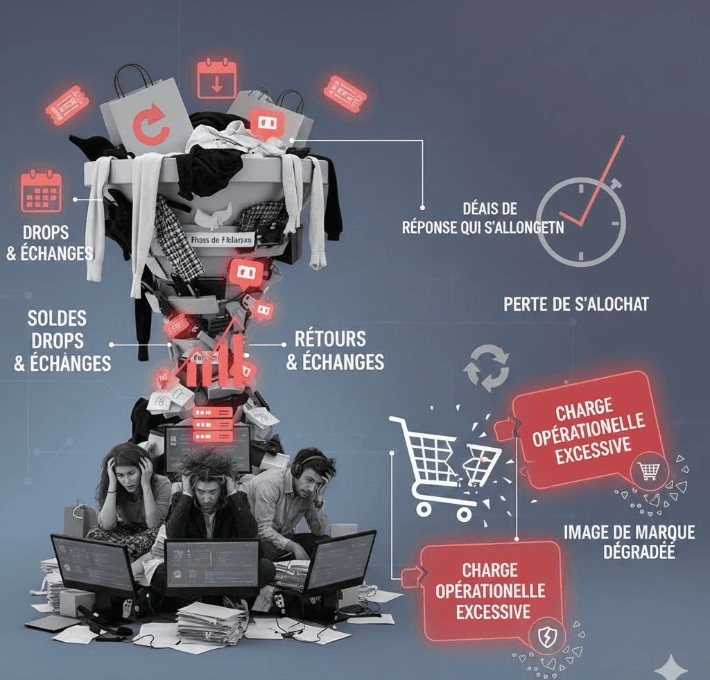 Une intervention ciblée sur les flux à fortes charge : retours, livraisons, tailles et échanges.